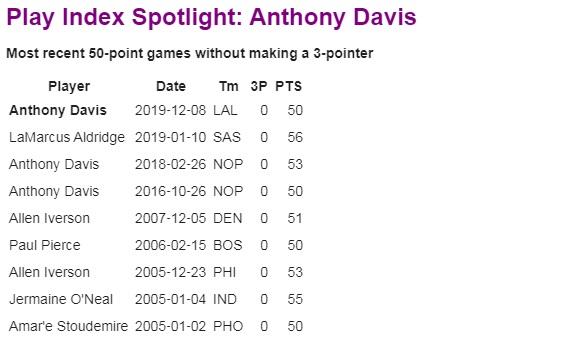 En esta era de tiradores de tres puntos, Anthony Davis llegó a 50 puntos sin encestar un sólo tiro a distancia de 3. Incluso, según Basketball-Reference.com es la tercera vez desde el 2016 que Davis supera los 50 puntos sin concretar un tiro de tres puntos.