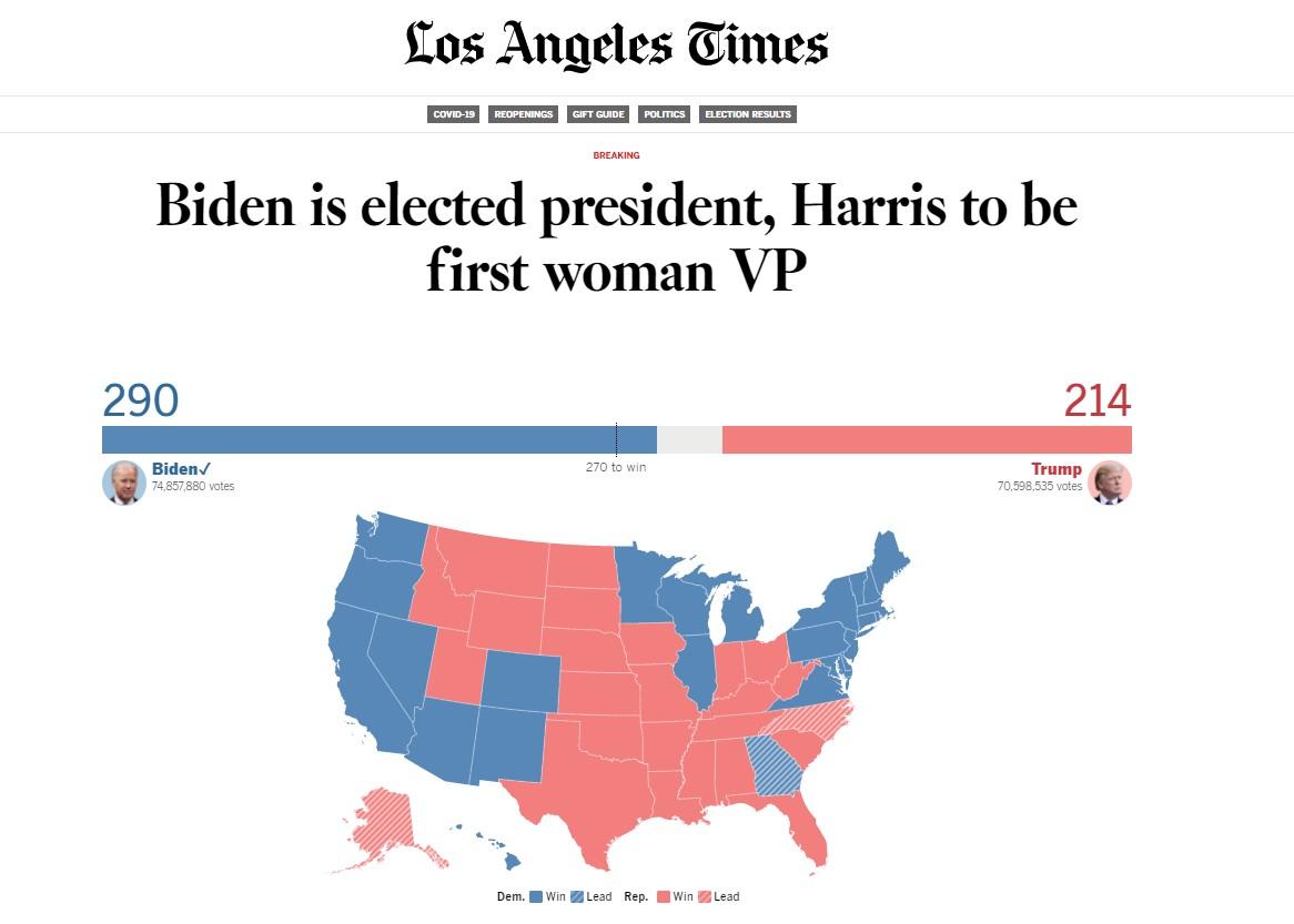 Los Ángeles Times - "Biden es elegido presidente; Harris será la primera vicepresidenta".