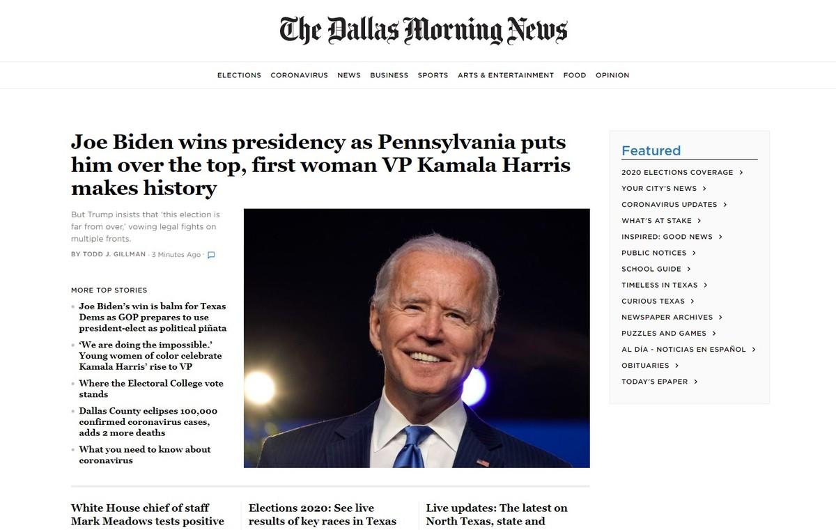 The Dallas Morning News - "Joe Biden gana la presidencia cuando Pensilvania lo coloca en la cima, la primera mujer vicepresidenta Kamala Harris hace historia.