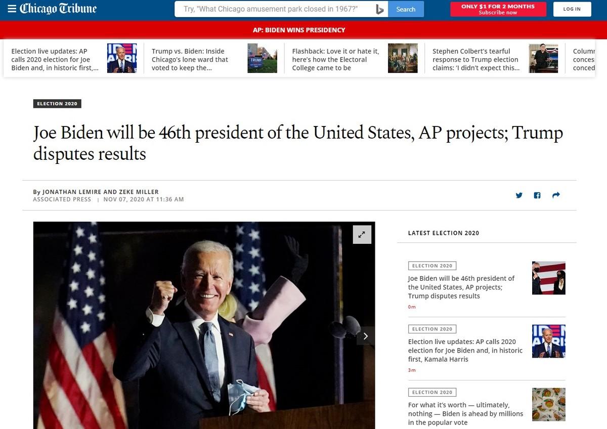 Chicago Tribune - "Joe Biden será el 46° presidente de Estados Unidos, AP projects; Trump peleará los resultados".
