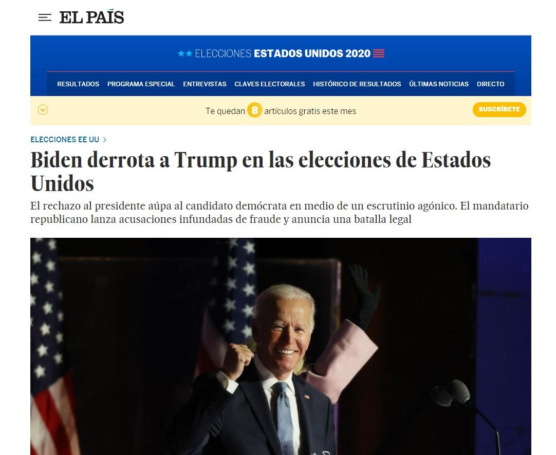 Por su parte, medios internacionales también reaccionaron ante la victoria de Biden.El País (España) - "Biden derrota a Trump en las elecciones de Estados Unidos".