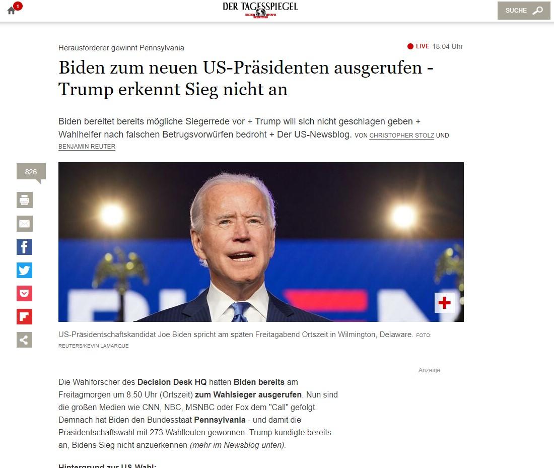 Der Tagesspiegel (Alemania) - "Biden se proclama como nuevo presidente de Estados Unidos; Trump no reconoce el resultado".