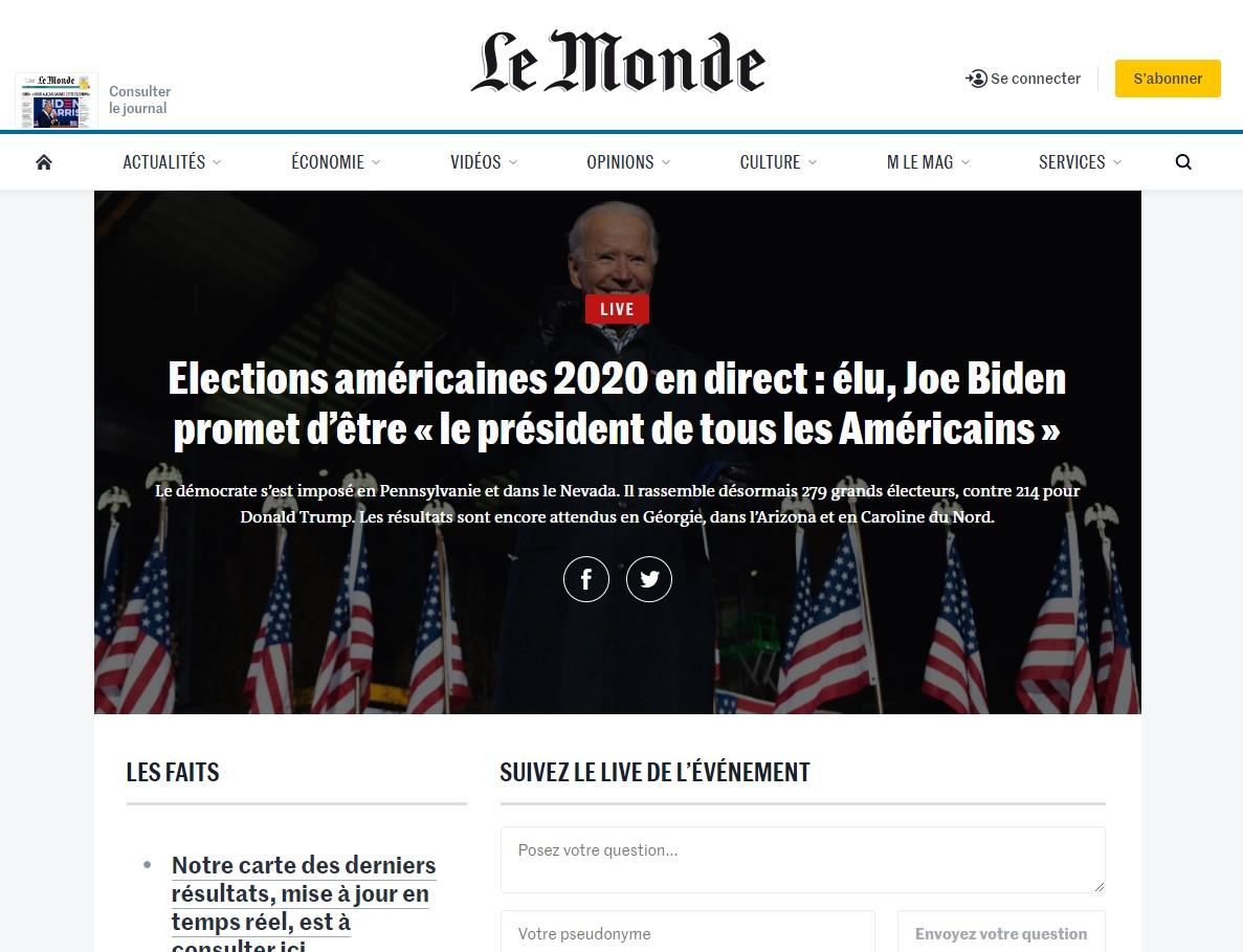 Le Monde (Francia) - "Joe Biden promete ser el presidente de todos los estadunidenses; escenas de júbilo en el campo"