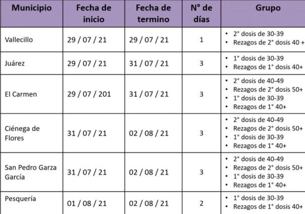 MONTERREY.- Durante la rueda de prensa de la Secretaría de Salud del estado de Nuevo León, el Secretario de Salud, Manuel de la O Cavazos, dio a conocer el calendario de vacunación para habitantes del municipio de San Pedro Garza García.Las vacunas aplicadas para el municipio serán el día 31 de julio al 2 de agosto del 2021 en donde se contemplara a:Personas de 30 a 39 de primera dosisPersonas de 40 a 49 años de segunda dosisPersonas rezagadas de 50 años de segunda dosisPersonas rezagadas de 40 años de primera dosisLa vacunación de primeras dosis para personas de 30 a 39 años y rezagados de primera dosis será el próximo martes, miércoles y jueves.