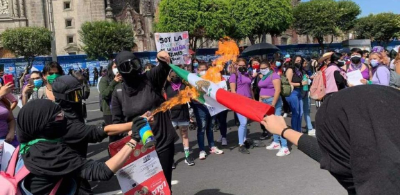Incendian bandera de México frente a Palacio Nacional durante marcha de mujeres