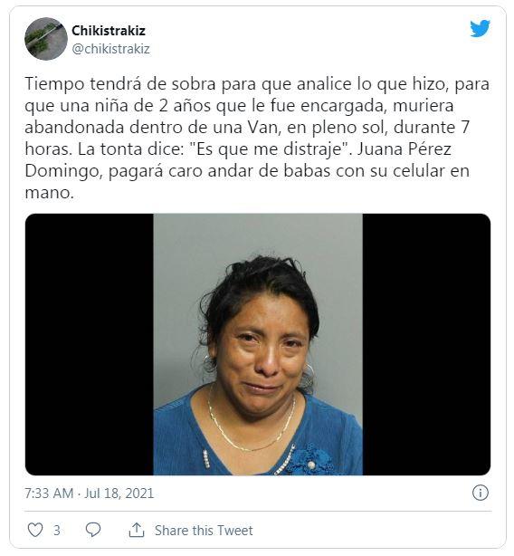 La Policía de Miami-Dade dijo que Juana Pérez-Domingo, quien abandonó a la niña en su carro, provocándole la muerte por un golpe de calor, tampoco tenía licencia de manejo, por lo que se suma este delito al cargo de homicidio agravado. Autoridades programarán una autopsia al cuerpo de la menor.Asimismo, se le fijó una fianza de de 50 mil dólares.