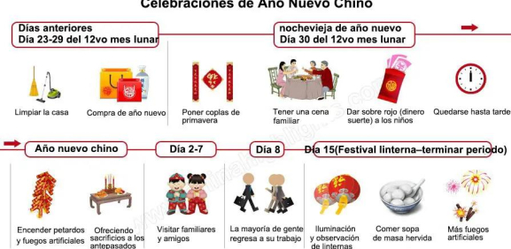 CÓMO SE CELEBRA EL AÑO NUEVO CHINOAunque en la mayor parte del mundo el tradicional "año nuevo" se celebra el último de diciembre, China se basa en su calendario lunar e incluso su manera de festejar es muy diferente a otros.Existen cuatro actividades principales que conforman esta celebración. Edificios, casas, locales y calles en general son decoradas de rojo, este color es el principal en el festival, ya que se cree que es un color que atrae energía positiva. Algunos chinos adoran a sus antepasados en la víspera de Año Nuevo Chino, antes de la cena de reunión, para mostrar que están poniendo a sus antepasados en primer lugar.La cena de Nochevieja se llama "cena de reunión" y se cree que es la comida más importante del año. Los platos con un significado de suerte se deben incluir en la cena, como pescado, ravioles y rollitos de primavera.Después de la cena de reunión, las familias normalmente se sientan juntas para ver la Gala del Festival de la Primavera, uno de los programas de televisión más vistos en China. Al mismo tiempo, la mayoría de las personas envían sobres rojos o mensajes cortos de WeChat a conocidos por teléfono.Al igual que en Navidad en otros países, en China las personas intercambian regalos durante el Festival de la Primavera. En las áreas rurales y para las personas mayores la tradición de dar regalos sigue vigente, sin embargo, las personas jóvenes cada vez más prefieren simplemente recibir sobres rojos (a mano o electrónico por Wechat).