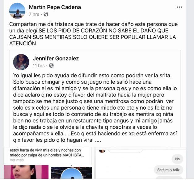 Jaimes, afirmó que Ortiz Castañeda ha irrumpido con la tranquilidad de su hogar, pues ha tirado balazos en su casa, además de romper los vidrios y agredir a su familia y amigos.Asimismo, afirmó que cualquier atentado hacia su persona, hace responsable a David Cabrini.“Con esto quiero dejar dicho que cualquier cosa que me pase, lo que sea, que desaparezca, que me maten, lo que sea, hago responsable a David Cabrini Ortiz Castañeda, porque estoy amenazada de muerte y no me voy a quedar callada. Tengo miedo de salir a la calle y todo”, afirmó.Por otra parte, la mujer asegura que perdió su trabajo debido a que el hombre fue a buscarla y amenazarla.