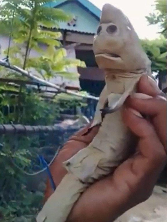 Un tiburón bebé con un "rostro humano" ha causado un poco de alboroto en línea en Indonesia hoy, después de que un pescador de Rote Ndao, dijera que encontró a la peculiar criatura después de cazar a su madre recientemente.El extraño descubrimiento salió a la luz después de que el pescador, identificado como Abdullah Fero, de 48 años, fuera a su casa para cortar un tiburón adulto que había atrapado en su red de arrastre mientras pescaba de noche durante el fin de semana. Abdullah dijo más tarde a los medios de comunicación locales que encontró tres cachorros en su estómago.Mientras que dos de los cachorros parecían tiburones normales, el otro cachorro tenía dos ojos grandes debajo de su hocico y una boca grande, lo que lo hacía parecer como un humano.