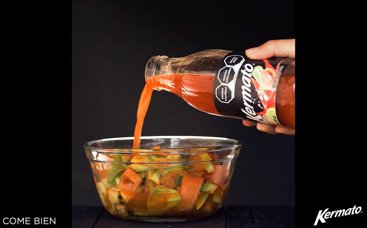 Ingredientes: 100 gr de camarón Jugo de limón 1 pizca de sal ½ pepino en cubos 1 aguacate en cubos 1 jitomate en cubos 30 gr cilantro picado 2 cdas salsa nayarita 2 cdas de cátsup 1 cdita de pimientaPreparación: En un bowl profundo, mezcla todos los ingredientes líquidos (jugo de limón, salsa nayarita y la cátsup). Integra bien y agrega la pizca de sal y la pimienta.Integra a la mezcla el resto de los ingredientes con una cuchara y por último dale se toque especial de Kermato al gusto.Sirve sobre tostadas deshidratadas o galletas saladas.