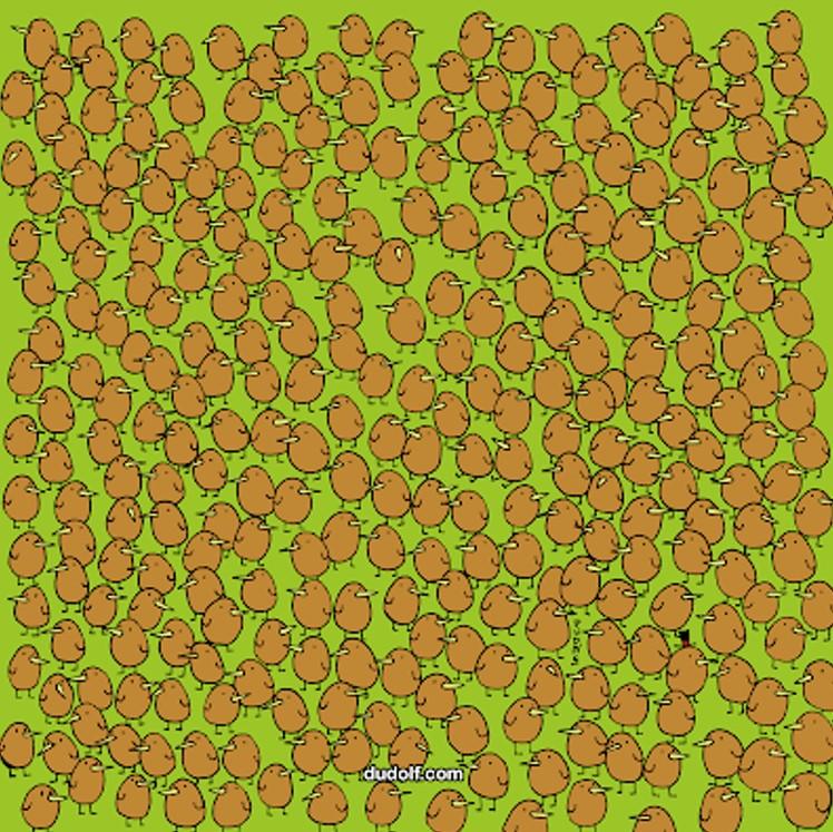 Gergely Dudás es nuestro ilustrador favorito por sus divertidos y entretenidos retos visuales que comparte a través de sus redes sociales. En esta ocasión tienes una complicada tarea que podría parecer sencilla.En la ilustración podemos ver una gran cantidad de tiernos y pequeños pájaros, dentro de los cuales tendrás la sencilla tarea de encontrar los CUATRO kiwis que de encuentran escondidos en la imagen. Fija bien tu atención en los detalles y no permitas que los colores tan similares lleguen a confundirte. Pon el cronómetro, concéntrate y logra resolver este divertido juego en el menor tiempo posible. ¡VAMOS!