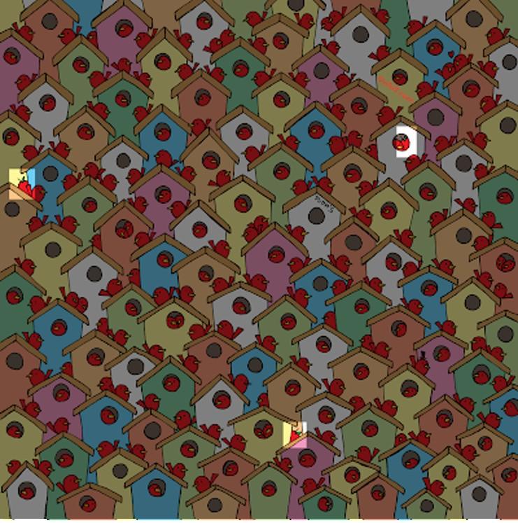 Gergely Dudás es nuestro ilustrador favorito por sus divertidos y entretenidos retos visuales que comparte a través de sus redes sociales. En esta ocasión tienes una complicada tarea que podría parecer sencilla.En la ilustración podemos ver una múltiple cantidad de casitas de pajaritos, de aquellas de madera que podemos ver colgadas en algunos árboles, además de estar acompañada de varios de estos animalitos. En esta ilustración tendrás un pequeño reto: encontrar TRES manzanas escondidas entre los pájaros y sus casitas.Fija bien tu atención en los detalles y no permitas que los colores lleguen a confundirte. Pon el cronómetro, concéntrate y logra resolver este divertido juego en el menor tiempo posible. ¡VAMOS!