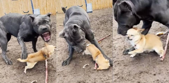 Un diminuto chihuahua trató de hacerle frente a un mastín italiano y sólo consiguió que le pisaran su carita, provocando su huida mientras lloraba en el camino.