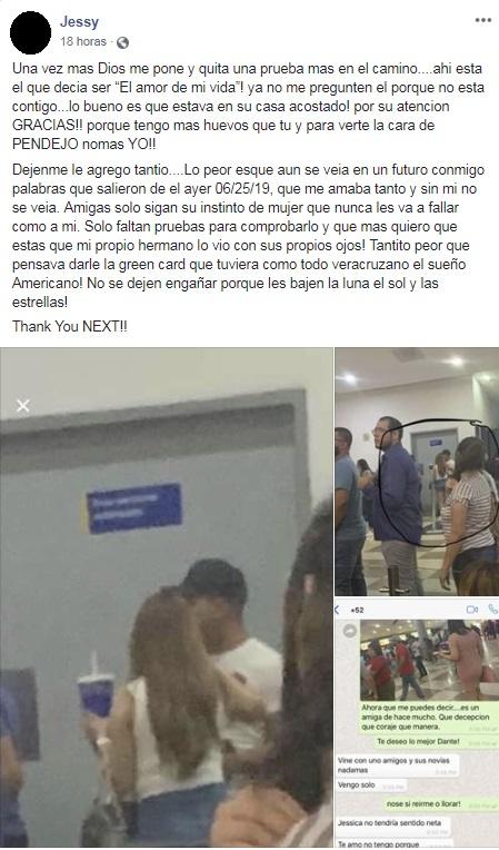 La chica realizó una publicación en redes sociales escribiendo el siguiente texto:"Una vez mas Dios me pone y quita una prueba mas en el camino....ahi esta el que decia ser “El amor de mi vida”! ya no me pregunten el porque no esta contigo...lo bueno es que estava en su casa acostado! por su atencion GRACIAS!! porque tengo mas huevos que tu y para verte la cara de PENDEJO nomas YO!! Dejenme le agrego tantio....Lo peor esque aun se veia en un futuro conmigo palabras que salieron de el ayer 06/25/19, que me amaba tanto y sin mi no se veia. Amigas solo sigan su instinto de mujer que nunca les va a fallar como a mi. Solo faltan pruebas para comprobarlo y que mas quiero que estas que mi propio hermano lo vio con sus propios ojos! Tantito peor que pensava darle la green card que tuviera como todo veracruzano el sueño Americano! No se dejen engañar porque les bajen la luna el sol y las estrellas!Thank You NEXT!!"